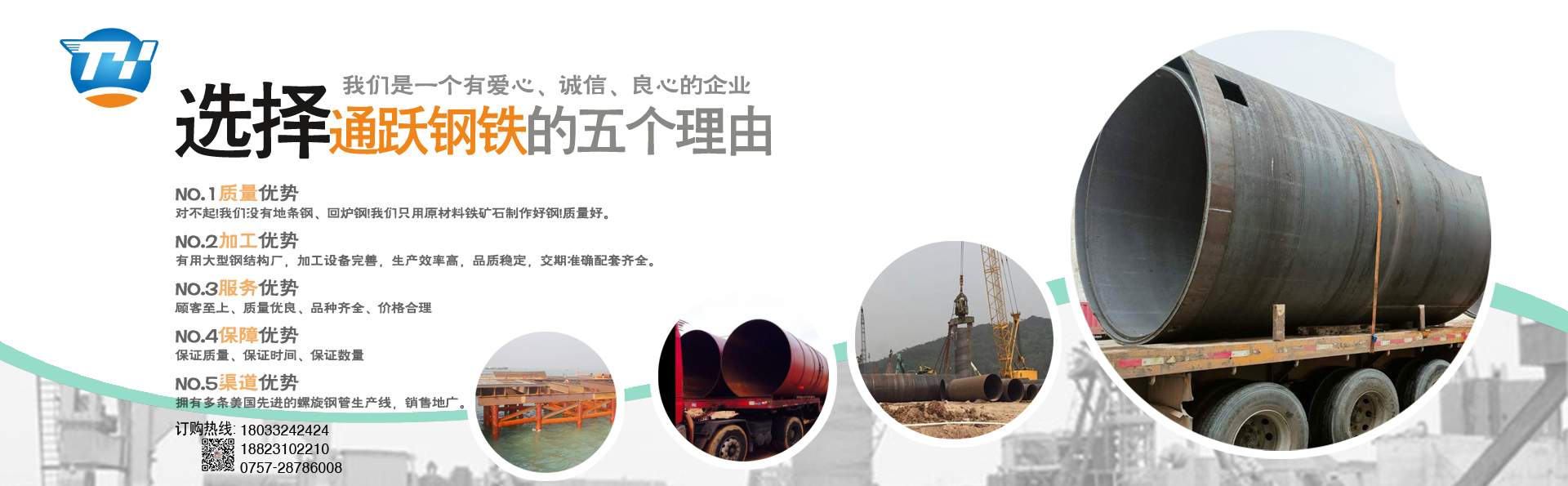 佛山市通躍鋼鐵有限公司 擁有多條先進的螺旋鋼管生產線,生產直徑φ159-φ3620mm(壁厚6mm-20mm)的雙面埋弧螺旋焊鋼管。 生產螺旋管 螺旋鋼管 螺旋焊管 規格厚度6mm-20mm 直徑159mm-3620mm 有多條鋼板卷管機生產規格厚度6mm-70mm 直徑400mm-5020mm 螺旋管 螺旋鋼管 鋼護筒 焊接鋼護筒 鋼板卷管 丁字焊管 加工格構柱 鋼管樁 材質Q235B Q345B Q235A 45# 20# Q420D Q390D 錳板 歡迎來電報價,公司配有大型型材 鋼板倉庫,大量各種規格現貨H型鋼 槽鋼 角鋼 工字鋼 鋼板,鍍鋅方管 鍍鋅產品 產品可以定尺定長,提供打砂,除銹,上油漆,公司配有防腐加工廠,專業對鋼管進行內外壁防腐加工,鋼管外壁主要有三油兩布,五油三布,環氧煤瀝青及環氧樹脂漆,各種高分子涂料。 ……了解更多